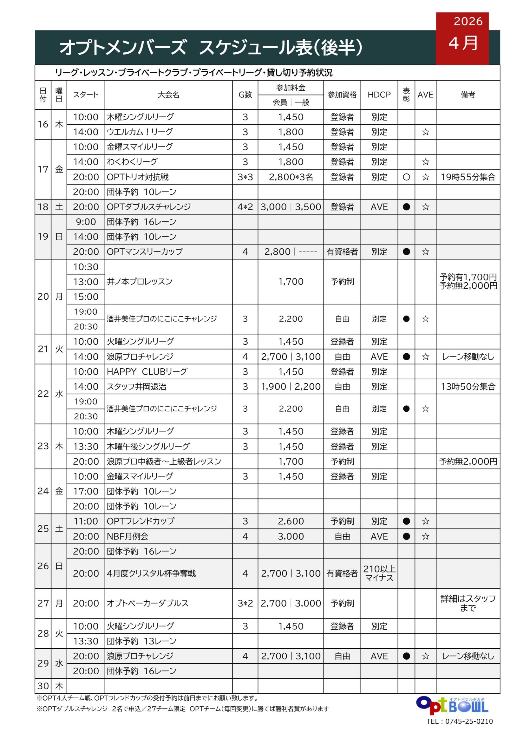| 一般・学生・幼児 | 1ゲーム 400円 |